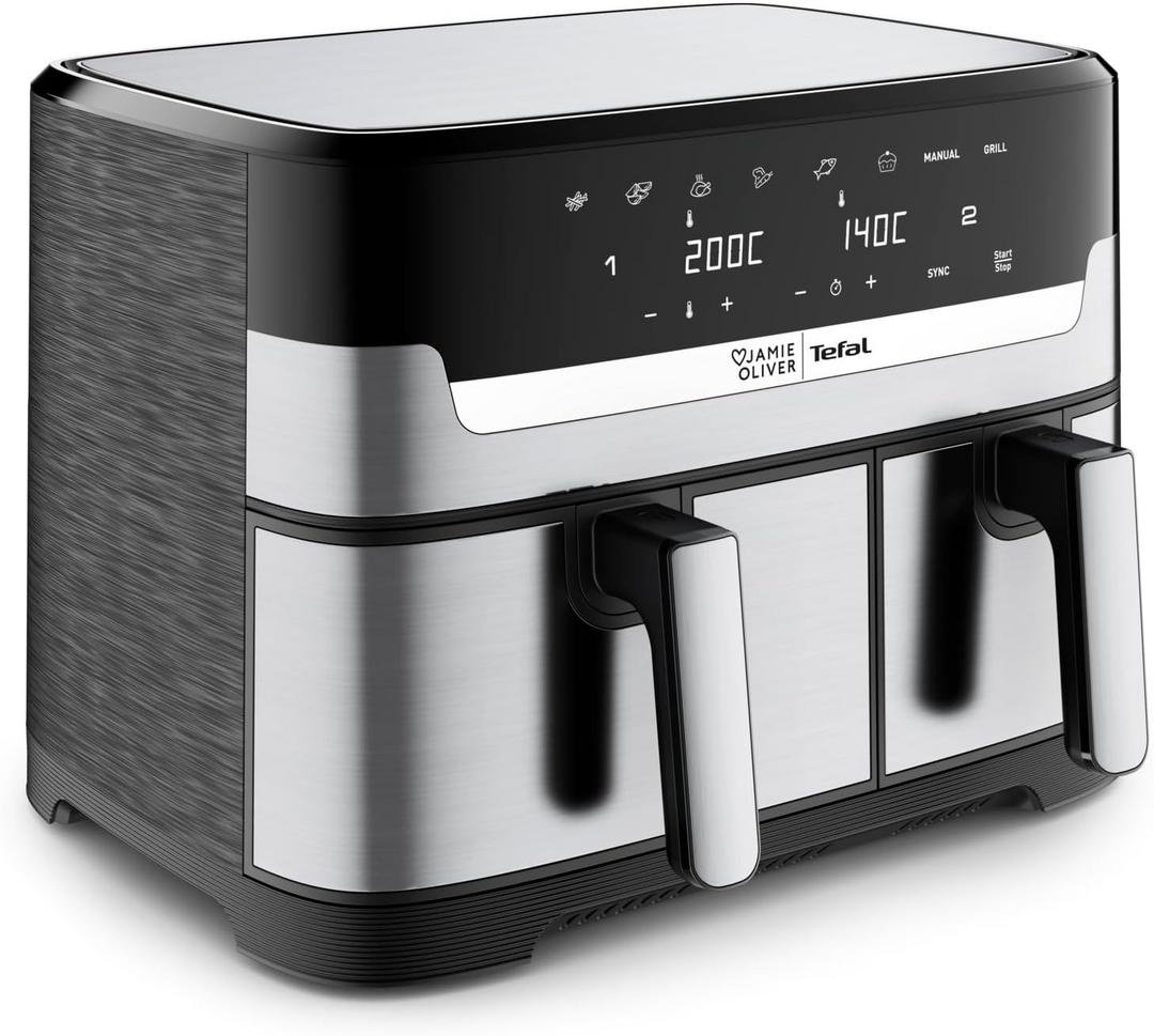 Die Tefal Dual Easy Fry & Grill EY905 setzt mit ihrem innovativen Doppelkammer-System neue Maßstäbe. Mit 8,3 Litern Gesamtvolumen eignet sie sich für bis zu 8 Personen.